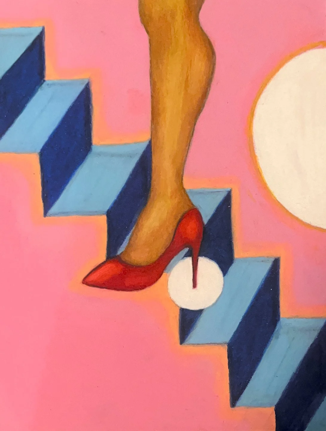 to perform femininity correctly, one must be seen but not heard. one must wear heels, but must not loudly announce one’s arrival - surgically separating our impeccable appearance from any autonomous actions. as we walk up the stairs, we shall take every step as an opportunity to be mute(d), stepping gingerly with the soles of our shoes and letting our heels float behind us. we timidly ascend, risking a stumble, a fall, or a break, all to be viewed as Pretty rather than Loud.